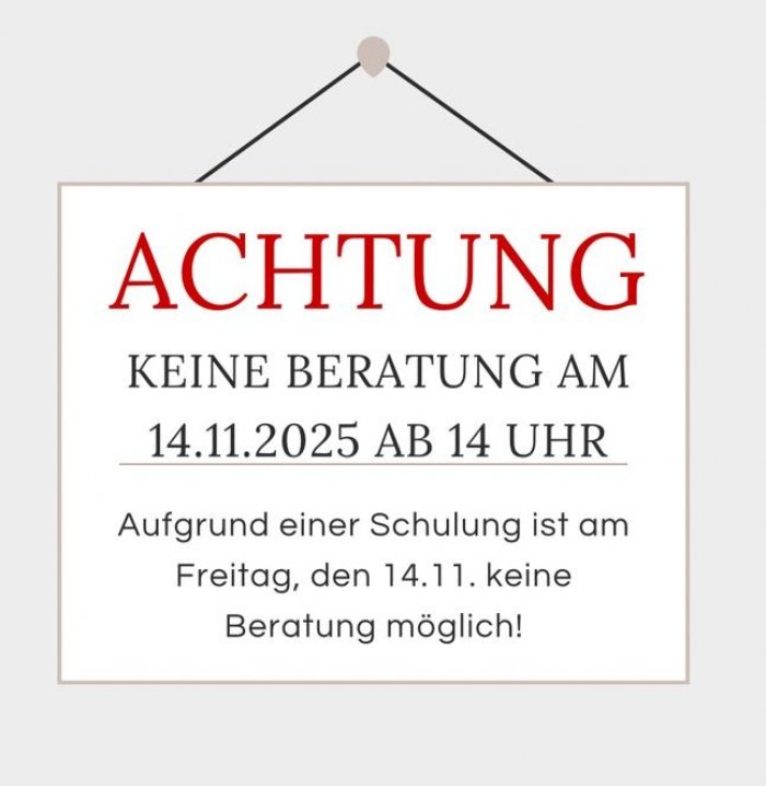 Achtung! Aufgrund einer Schulung ist am 14.11.2025 ab 14 Uhr keine Beratung möglich.